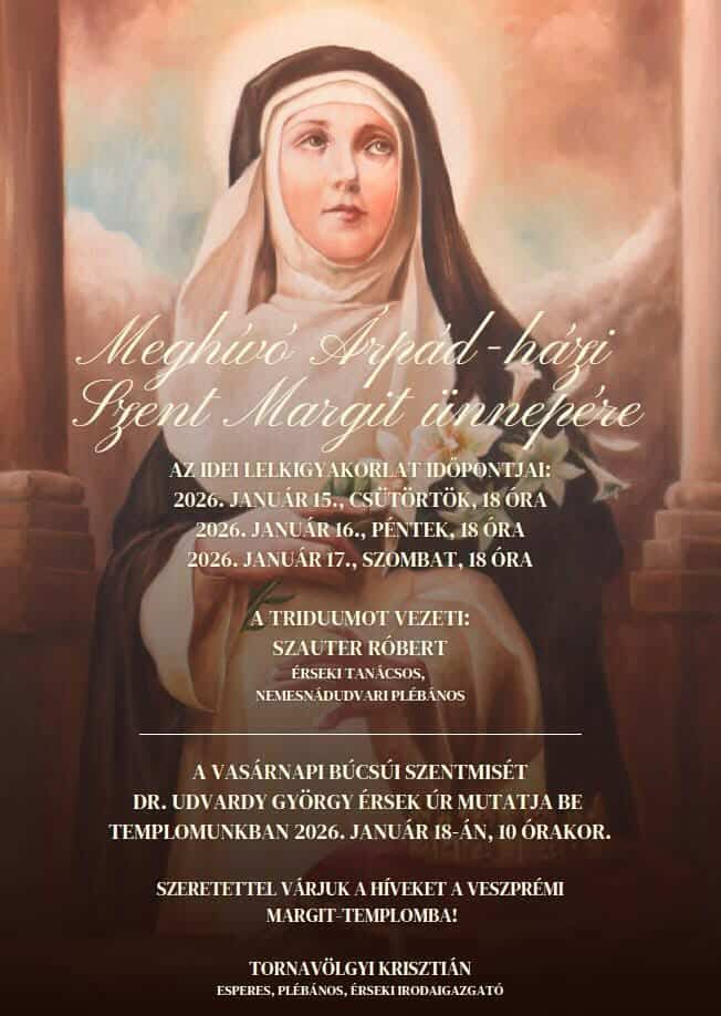 Szeretettel várjuk családjainkat óvodánk védőszentjének ünnepe alkalmából, a 3 napos lelki gyakorlatra az Árpád-házi Szent Margit templomba. (8200 Veszprém, Szent Margit park 1.)